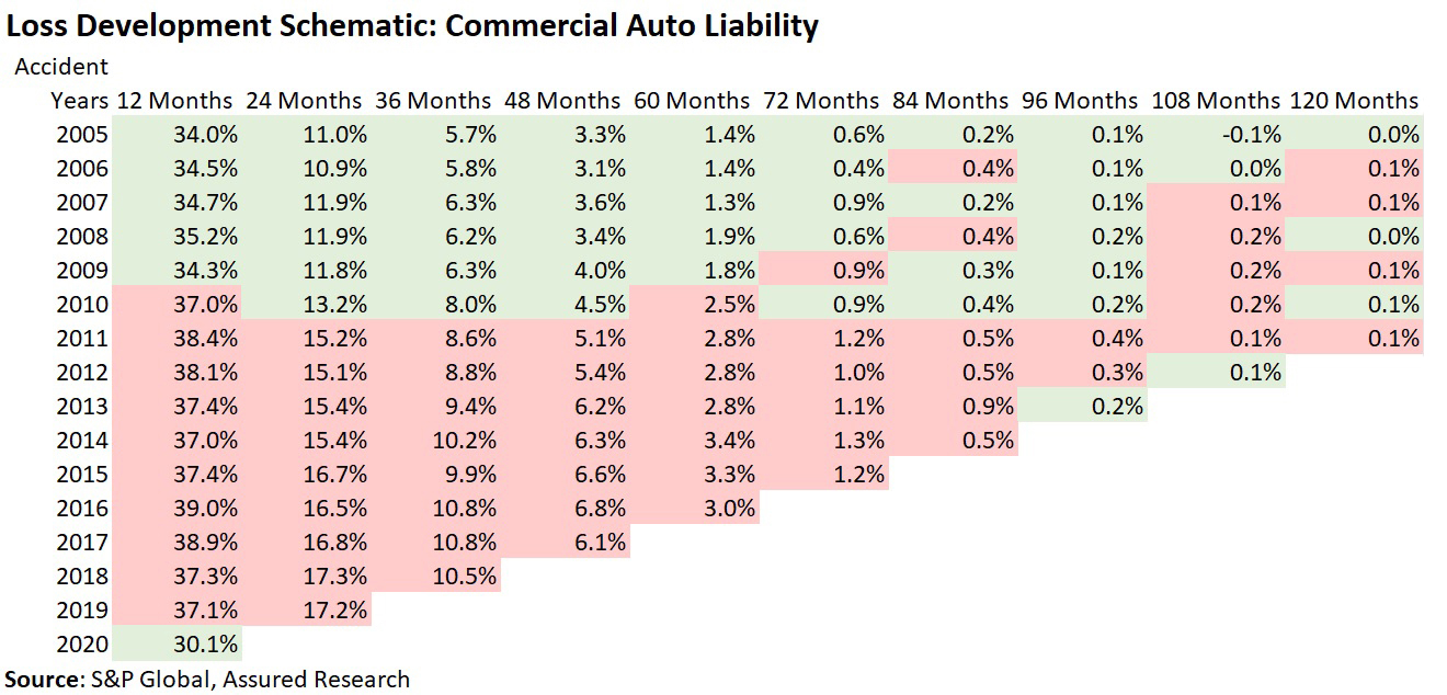 - Inflationary pressures continue to adversely impact older, presumably more severe claims along the diagonal of the triangle. In a recent report, we researched trends in traumatic brain injuries; they’re being added to many severe commercial auto claims and probably helping to keep the diagonal shaded red.