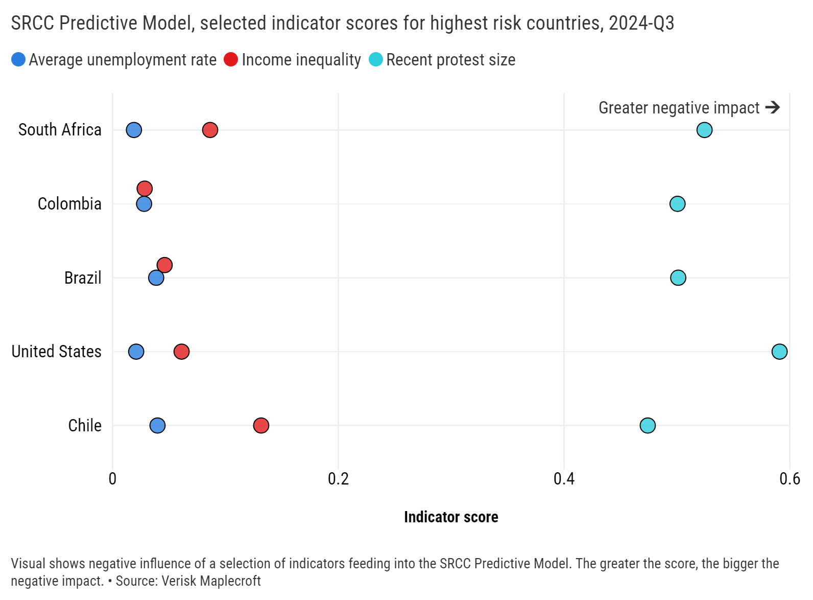 On the other hand, the likelihood of future SRCC events is often related to high levels of income inequality in combination with high levels of unemployment and inflation, Soltvedt added. “South Africa is a good example of that. With some of the world’s highest unemployment levels and very high levels of income inequality, South Africa is one of the highest risk countries in the world for SRCC risk.”