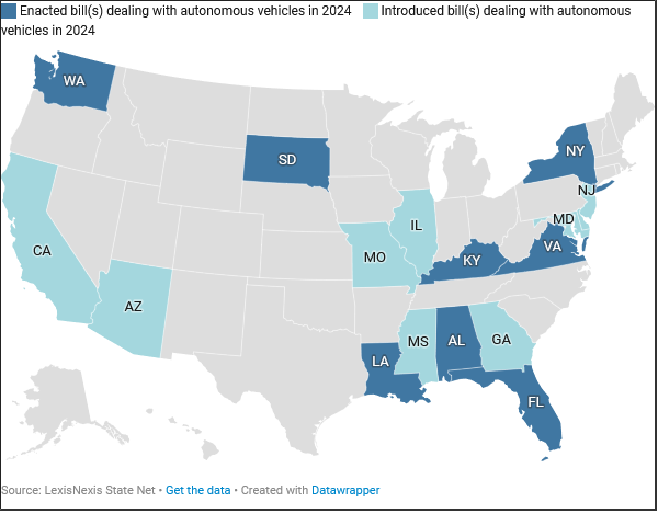 As vehicles progress through the various stages, state lawmakers are making changes, too. More than 70 AV-related legislation bills have been introduced in 17 states. Most of the bills focus on insurance requirements, with nine having been enacted, according to a September 2024 LexisNexis report. The emerging laws, however, may not only impact how AVs are insured but also, in the case of an accident, how fault is determined.