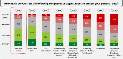 Trust isn’t a buzzword here. It’s the foundation of adoption. Consumers share data only when they believe insurers will protect it and use it to create real value. In fact, 53% of respondents expressed high trust in insurers’ handling of personal data, ranking insurers second only to banks. That trust translates into action: willingness to switch plans, share driving scores and pay for connected services.