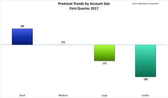 Small accounts (up to $25,000) were assessed a 1 percent rate increase in the first quarter of 2017. Medium accounts ($25,001-$250,000) were flat, while both large ($250,001-$1 million) and jumbo (over $1 million) accounts enjoyed rate decreases, coming in at minus 1 percent and minus 2 percent, respectively.