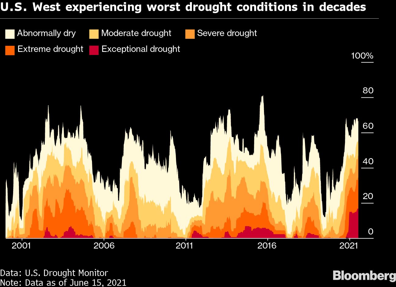 From June 2020 to May 2021, California posted its driest 12-month period on record, according to the National Centers for Environmental Information. So too did Arizona and Utah, while Idaho, Wyoming, New Mexico, Nevada and North Dakota all placed in the top 10. California just finished its fourth driest spring on record; Washington, Oregon and Idaho their second. Forecasts call for drought to remain locked in across the West, and by August drought conditions could spread into Nebraska and eastern Colorado.