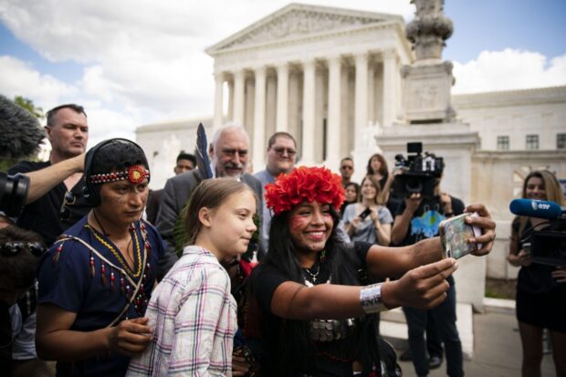 Photograph: Militza Flaco, a climate activist from Panama, right, uses a mobile device to take a selfie photograph with Swedish activist Greta Thunberg, center, following a news conference outside the Supreme Court in Washington, D.C., on Sept. 18, 2019. Photo credit: Al Drago/Bloomberg