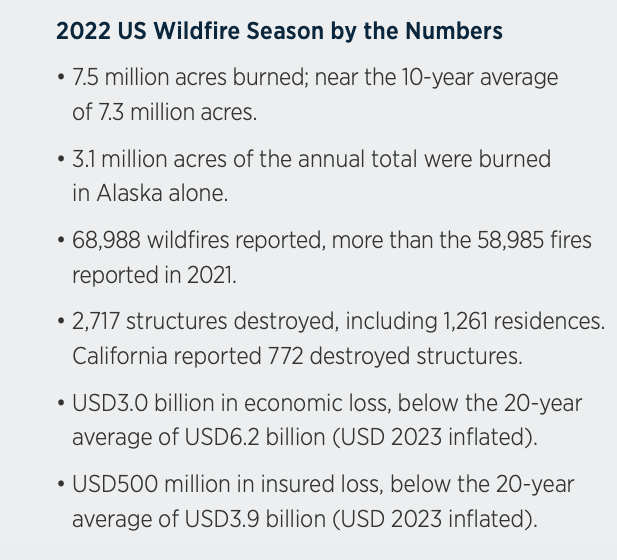 “A myriad of factors led to below-average financial loss from wildfire in 2022, including weather patterns, geography, exposure and availability of ignition sources,” the report stated.