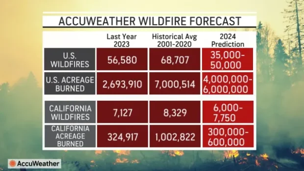 AccuWeather’s forecast for the 2024 wildfire season predicts between 4 and 6 million acres of land to be burned in 2024, well below the historical average of 7 million acres.