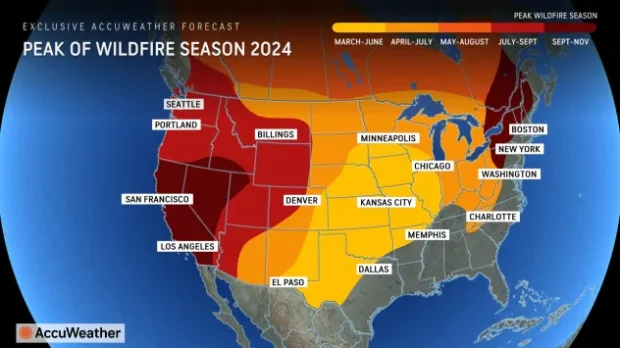 “If extended streaks of heat and dryness occur in May and June, the risk of wildfires can start earlier during the summer, increasing rapidly into the fall for more significant fires,” AccuWeather Long-Range Forecaster Paul Pastelok warned in the report. “The combination of 2023 and 2024 wet seasons will contribute to extensive growth of new fuels.”