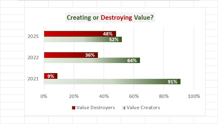 Three years ago, ACORD found that just over one-third (36) of the 100 largest insurers destroyed value. And in a 2021 comparable study, only 9 of 100 were value destroyers.