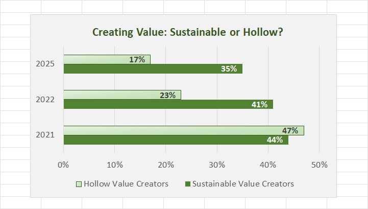 The ACORD analysis breaks the value creators into two categories: sustainable value creators that meet the required return threshold through underwriting and investment activities, and hollow value creators that do so through investment returns only while failing to generate value from underwriting.