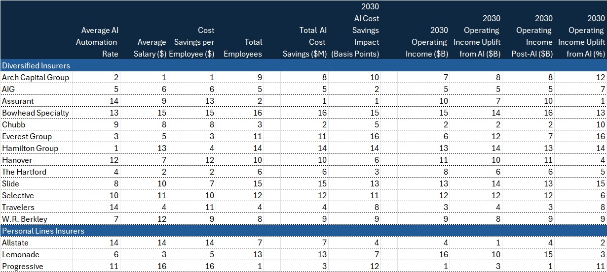 Below, we have indicated the relative rankings of all 16 carriers in the report for each of the input assumptions, as well as for the final projected AI impacts on 2030 operating earnings (basis point change, dollar change and percentage change).