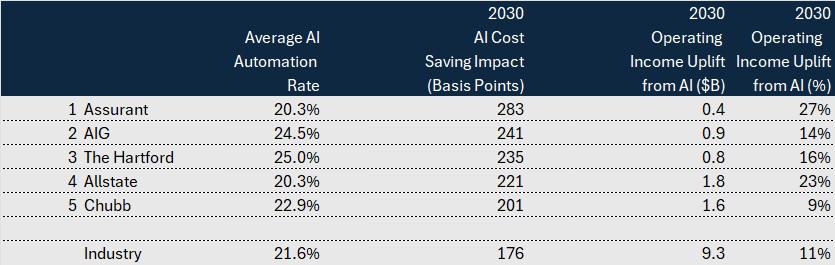 Below, we have excerpted the average automation rates and financial projections for the five P/C carriers that have the highest 2030 operating margin income uplift measured in basis points.