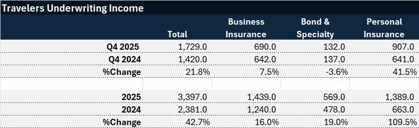 - After-tax underwriting income jumped 22% in the fourth quarter to $1.7 billion and more than 40% for the year to $3.4 billion. Personal insurance was a major contributor, with underwriting profit more than doubling in the segment last year.