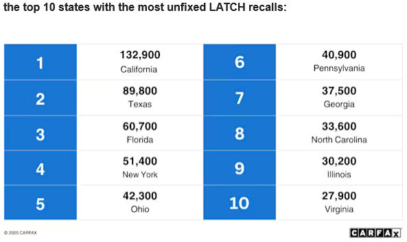 “LATCH systems are designed to protect our most vulnerable passengers,” said Faisal Hasan, vice president of Data at CARFAX. “These recalls are not isolated to just one automaker or model year, so parents should check right away if their vehicle has an open recall and schedule free repairs as soon as possible.”