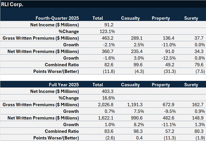 That’s how the chief executive officer of specialty insurer RLI delivered the news of his company’s unbroken 30-year record of underwriting profits on an earnings conference call Thursday. For 2025, underwriting income was $264.2 million, translating to a combined ratio of 83.6
