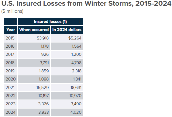 “To date, the largest winter storm by insured losses was the 2021 Texas freeze at $18 billion according to industry estimates,” Cooper said. “In recent years, homeowners and commercial property insurers have raised rates and changed policy terms to cover growth in losses from nonpeak perils such as winter storms.”