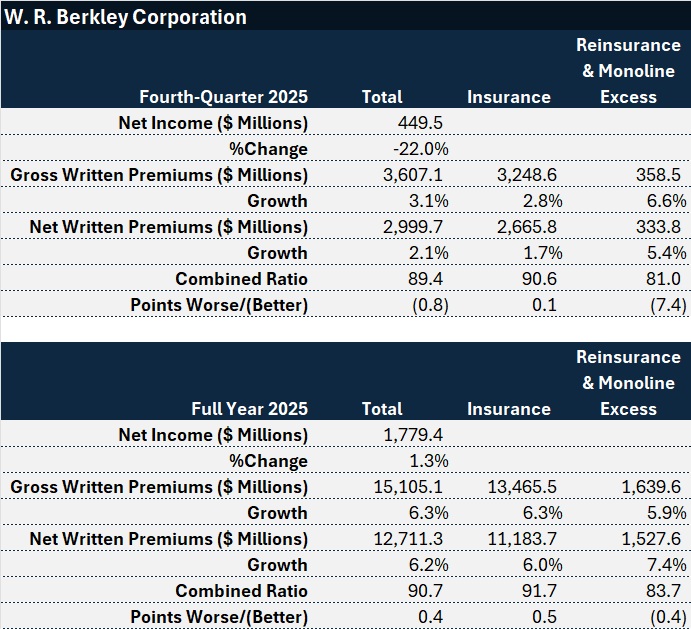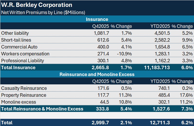 The W.R. Berkley earnings announcement included a line-by-line breakdown of the fourth-quarter and full-year 2025 net written premiums, summarized below.