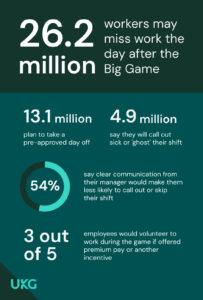 For the second year in a row, Super Bowl Monday will set a record for the number of U.S. employees who plan to miss work, according to UKG’s annual Super Bowl Fever Absenteeism Survey.