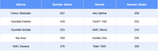 The top 10 most popular vehicles stolen in Arizona include the Chevrolet Silverado, which remains the top stolen vehicle, followed by Kia and Hyundai, representing four of the top six spots, and pickup trucks occupying four positions.