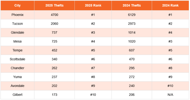 The City of Peoria, for example, has dropped out of the top 10, going from the #7 position with 301 thefts in 2024, to outside the top 10 with 168 thefts in 2025.