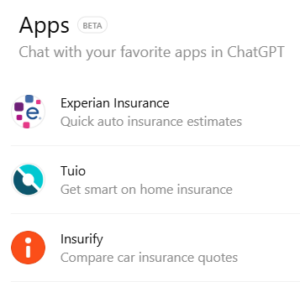 There is another ChatGPT app for insurance, Experian Insurance, offering “quick auto insurance estimates.”