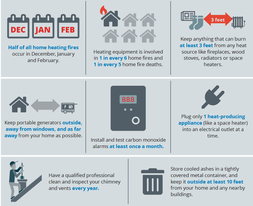 “Each winter, when heating systems kick into high gear, so do the number of home heating fires,” said Lorraine Carli, vice president of Outreach and Advocacy at NFPA. “Our goal is to make sure people know when and where home heating fires tend to occur, along with ways to prevent them.”