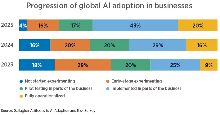 Global insurance brokerage Gallagher recently released its third annual AI Adoption and Risk Survey, which found that companies are increasingly integrating AI into their operations, focusing on IT operations, client-facing functions and analytics, with 63% of businesses having fully operationalized or implemented AI within parts of their business, up from 45% in 2024.