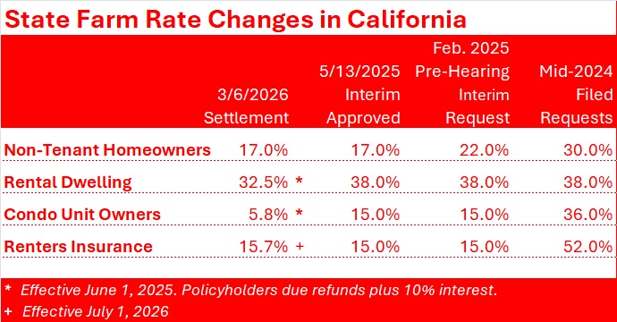 Both CDI and Consumer Watchdog, which served as intervenor in accordance with provisions of Proposition 103, announced the three-party settlement agreement late on Friday. State Farm has not posted an announcement about rates for residential property policies but did announce a 6.2% rate reduction for auto insurance of State Farm Mutual Auto in California earlier in the week.