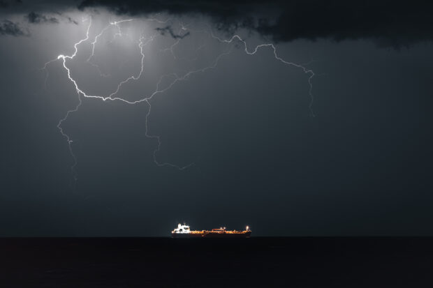Photograph: Lightning occurs while an oil products tanker sails into Muscat Anchorage on March 21, 2026 at Sultan Qaboos Port in Muscat, Oman. (Photo by Elke Scholiers/Getty Images)