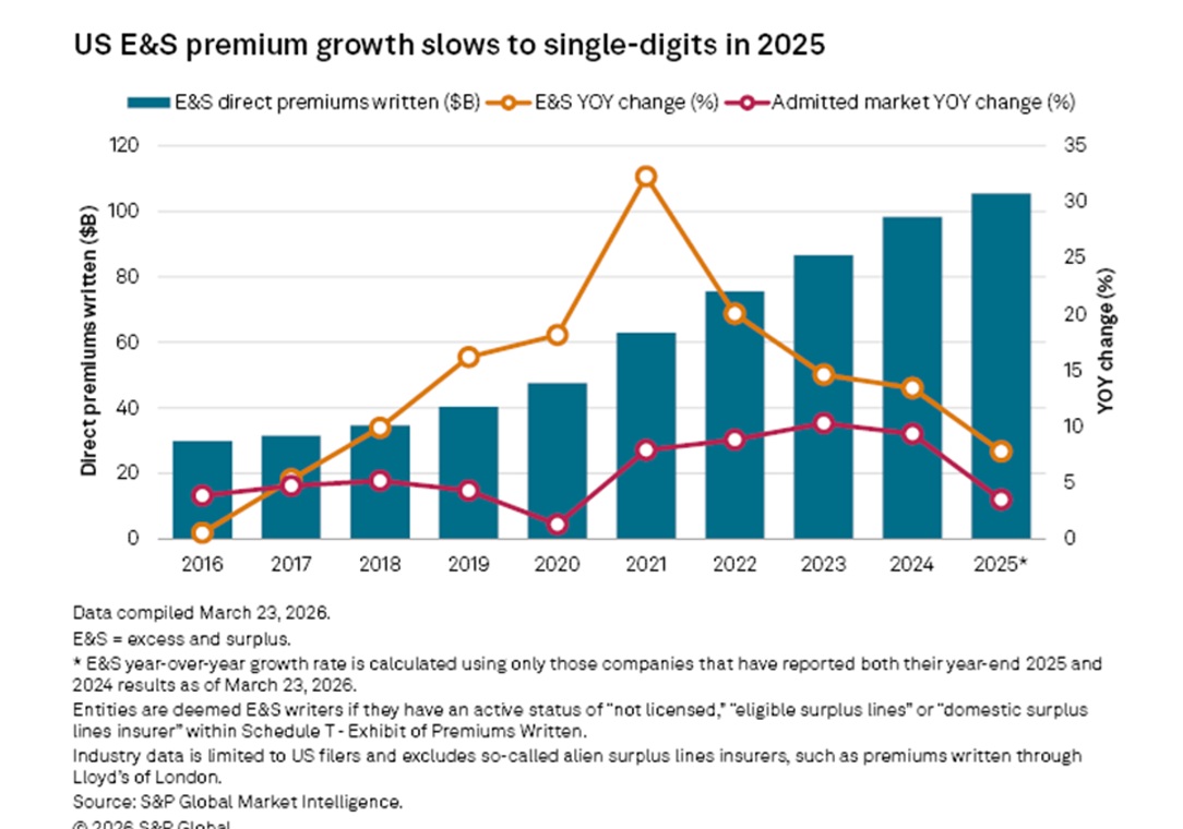 Previous reports from S&P GMI showed U.S. E&S direct premiums jumping 14.5% in 2023 and 13.4% in 2024, with those double-digit growth rates paling in comparison to a 32.3% percent rate of growth recorded in 2021.