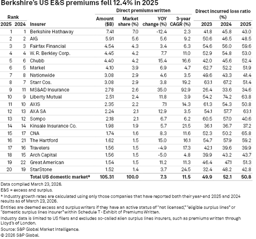 Contributing to the slumping growth rate, S&P GMI reported a drop in premiums for the largest U.S. E&S player—Berkshire Hathaway—last year. Berkshire Hathaway’s recorded 12.4% decline in overall E&S premiums to $7.4 billion was the largest drop among major insurers, with its E&S property business line falling 22.7% to $3.1 billion.